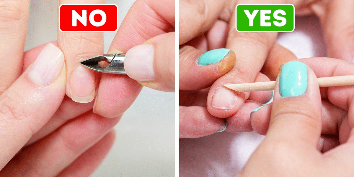 Cutting cuticles can lead to infections. Instead, gently push them back using a cuticle pusher after a warm shower.